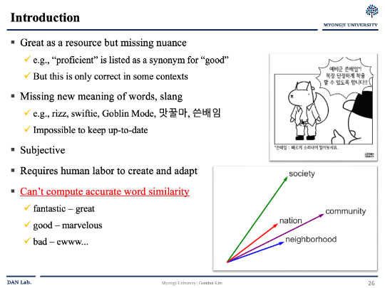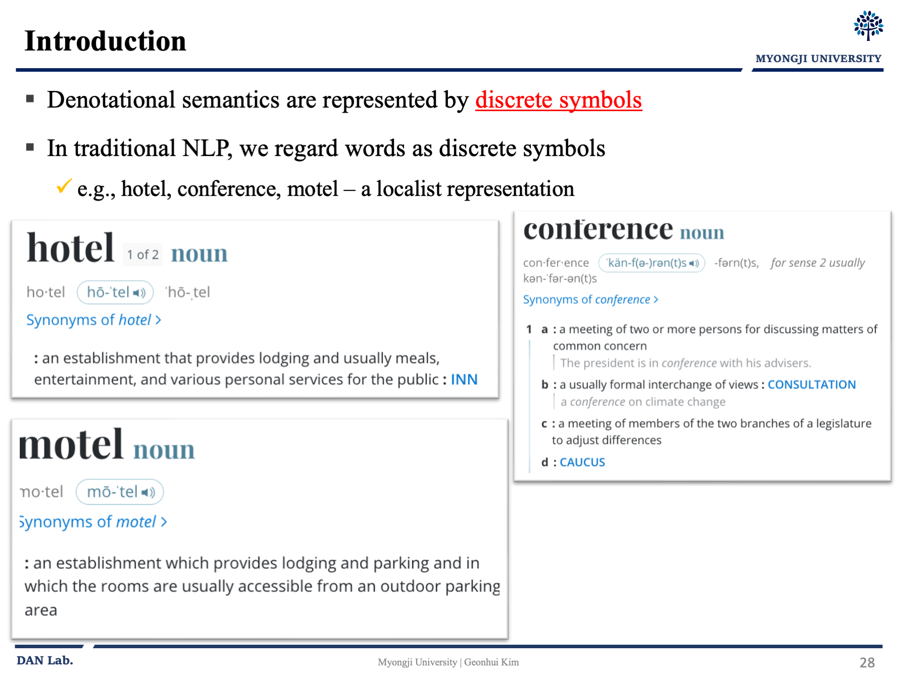 가장 큰 문제다. 슬라이드 그림과 같이 사전 형태로 나누어진 단어 표현은 단어들간의 유사성을 계산할 수가 없다.